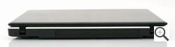 Vänster: AC-ström, VGA-ut, LAN, eSATA, HDMI-utgång, två USB-portar, ExpressCard/54-plats, SDHC-kortläsare